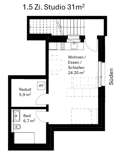 1.5 Zi. Studio | vermietet | 31 m2 | 12 m2 | |
