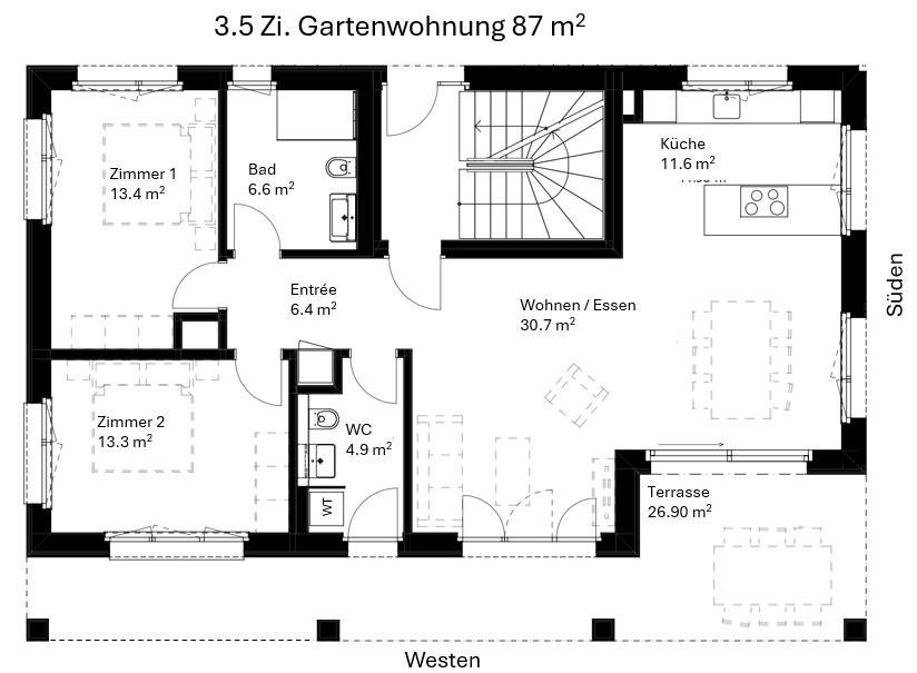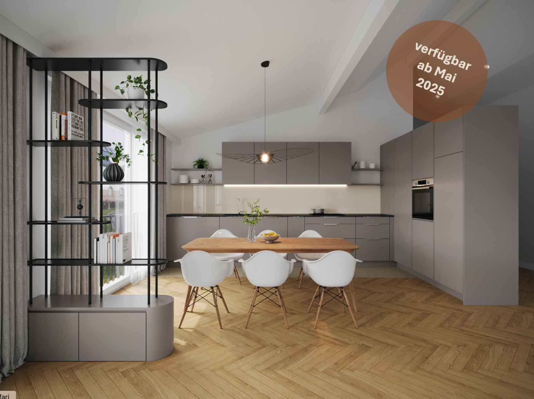 Diese lichtdurchflutete 3.5-Zimmer-Gartenwohnung (87 m²) überzeugt mit einem privaten, nach Süden und Westen ausgerichteten Garten und einem überdachten Sitzplatz, der zum Entspannen einlädt. Der grosszügige Wohn- und Küchenbereich (42 m²) bietet Platz für gesellige Stunden, während die stilvolle Küche mit Kochinsel und Bora-Abzug modernsten Komfort verspricht. Beide Schlafzimmer sind dank grosser Fenster hell und freundlich. Zwei Nasszellen, inklusive eigenem Waschturm, runden das Angebot ab. Ein elegantes Parkett im Fischgratmuster sowie ein harmonisch abgestimmtes Farbkonzept sorgen für eine behagliche Wohnatmosphäre