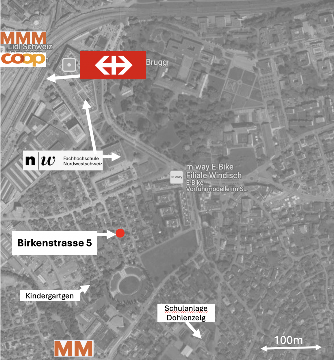 Die Birkenstrasse befindet sich in einer ruhigen, familienfreundlichen Nebenstrasse, ideal für Familien dank der Nähe zu Kindergarten und Schulen. Einkaufsmöglichkeiten, Restaurants, Cafés und Fachgeschäfte sind bequem zu Fuß erreichbar. Verkehrstechnisch ist die Lage optimal: Der Bahnhof Brugg ist in weniger als 5 Minuten zu Fuss erreichbar. Von dort aus sind Sie schneller in Zürich, Basel oder Bern als mit dem Auto.